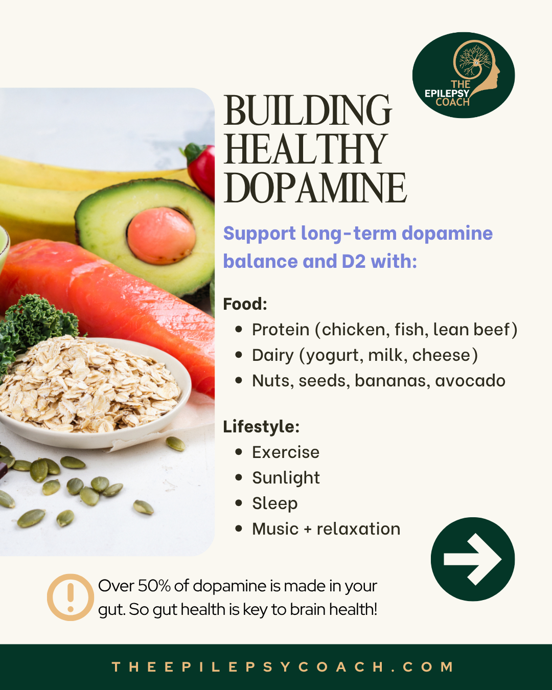 Diet, lifestyle, and mindset all influence dopamine activity, and not all dopamine responses are equal. Nutrient-dense foods such as quality proteins, Greek yogurt, cottage cheese, nuts, seeds, bananas, and avocados can support healthier dopamine balance. Key lifestyle habits, including regular exercise, sunlight exposure, quality sleep, relaxation, and social connection, also play an important role in supporting D2 receptors.